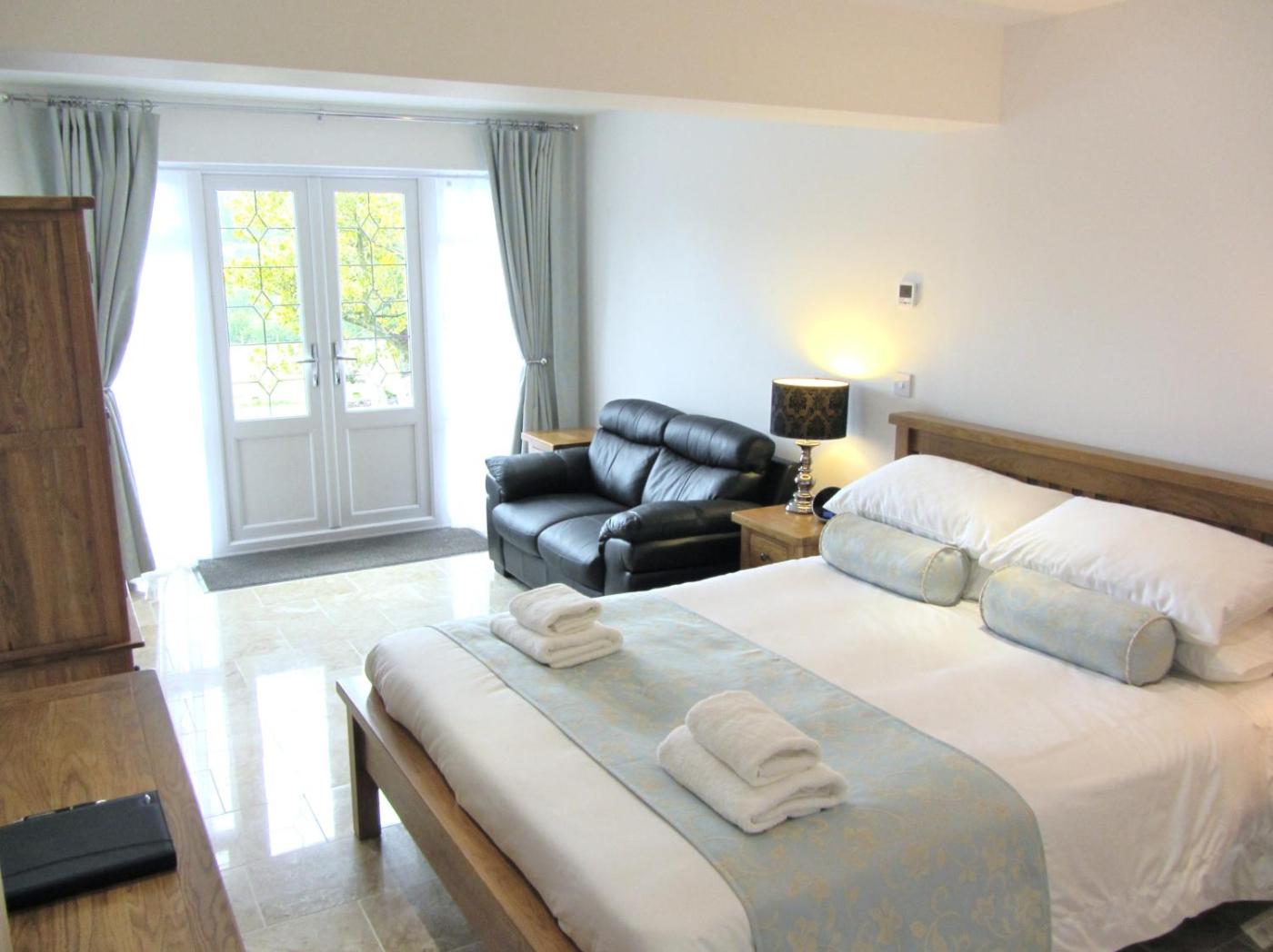 Deluxe Double Room. Situated on the ground floor with French doors opening out on to the patio.This room features an en suite shower roomwet room, a flat-screen TV, DVD player, fridge, microwave and tea and coffee making facilities.