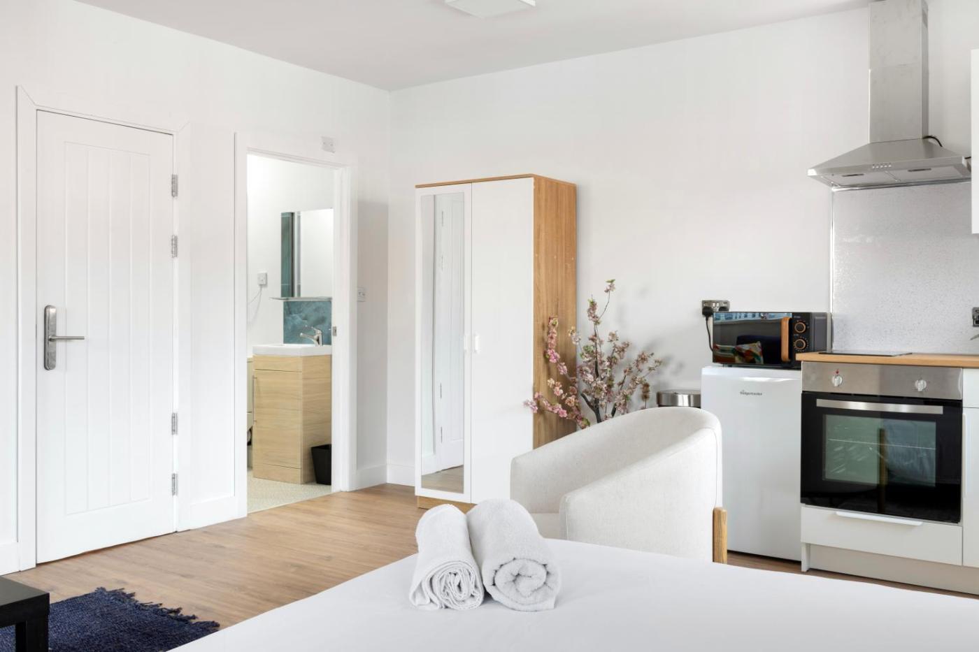 Studio. The well-fitted kitchenette features a stovetop, a refrigerator, an oven and a microwave. The studio provides a wardrobe, a sofa, as well as a private bathroom featuring a shower and a hairdryer. The unit offers 2 beds.