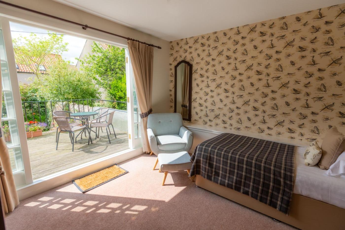 Garden Suite. Our Garden Room provides accommodation for a group of up to four people in 4 single beds. The Garden Room has 1 bathroom with a bath and shower over the bath and Scottish Fine Soaps Sea Kelp toiletries. Additional amenities include a flat-screen TV with Freeview channels, teacoffee making facilities. ;